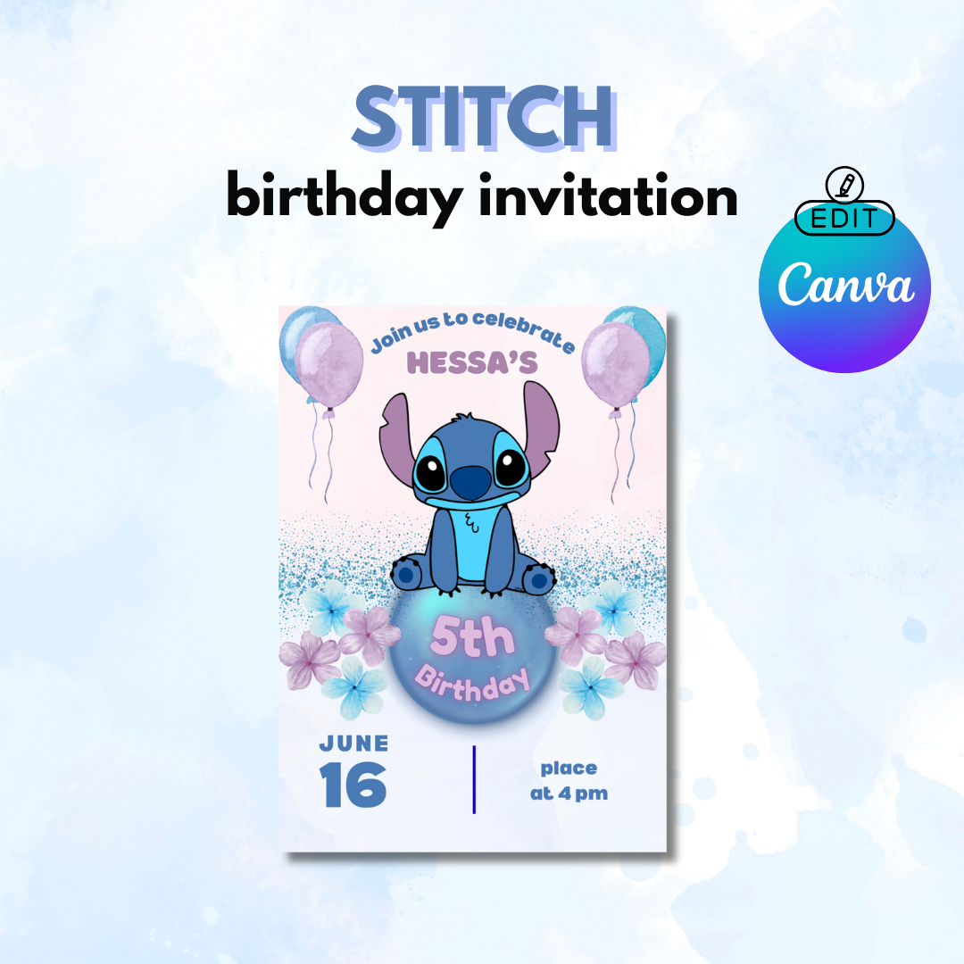 Celebrate your little one’s special day with this adorable Stitch birthday invitation! Featuring the beloved blue alien, pastel balloons, and floral accents, this design is perfect for a fun and colorful party.